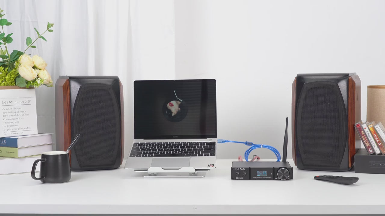 2.1 CH Wireless DAC Hifi Amplifier with EQ Control. MAX Power Output up to 120Watts x2@4ohm. DA2120C can drive most home bookshelf/desktop/outdoor(passive) speakers and powered subwoofers, offering low distortion and acoustically accurate audio reproduction. The bright digital LED display lets you see the settings you change easily and remote control for hassle-free adjust the inputs mode/volume/bass/treble.